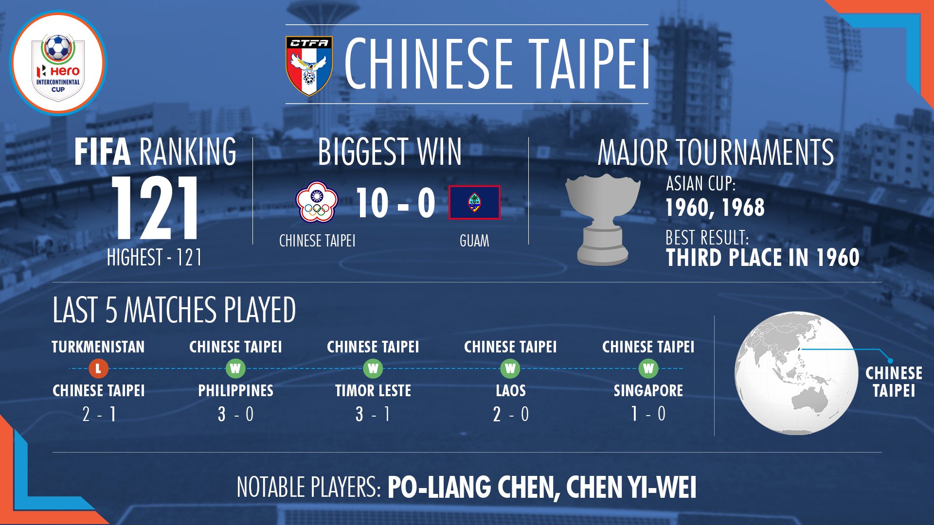 The chinese taipei football association (ctfa) was founded in mainland china as the china football association (cfa) in 1924 and relocated to taiwan in 1949 at the end of the chinese civil war chinese taipei. The chinese taipei national football team represents taiwan (the republic of china) in international football and is controlled by the chinese taipei football association, the governing body for football in taiwan.